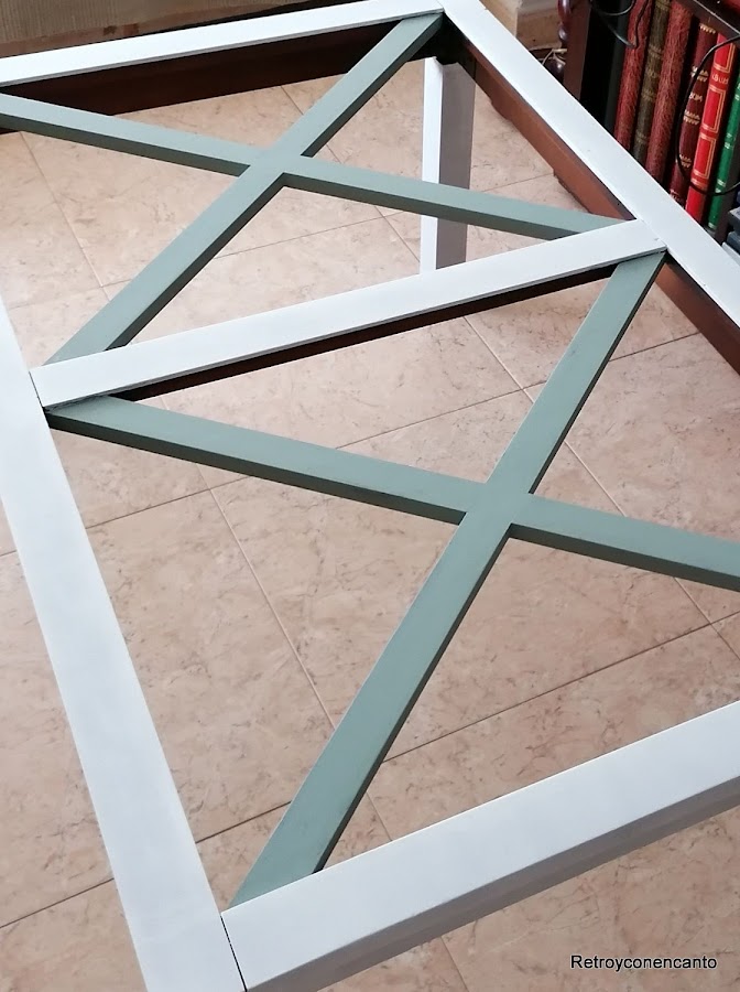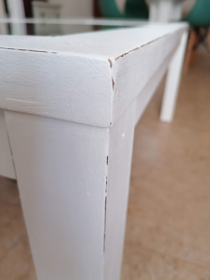 El contraste nos gustó, así que continuamos pintando en ese verde desgastado el interior de nuestra mesa. Al finalizar el tiempo de secado, lijamos levemente las aristas.