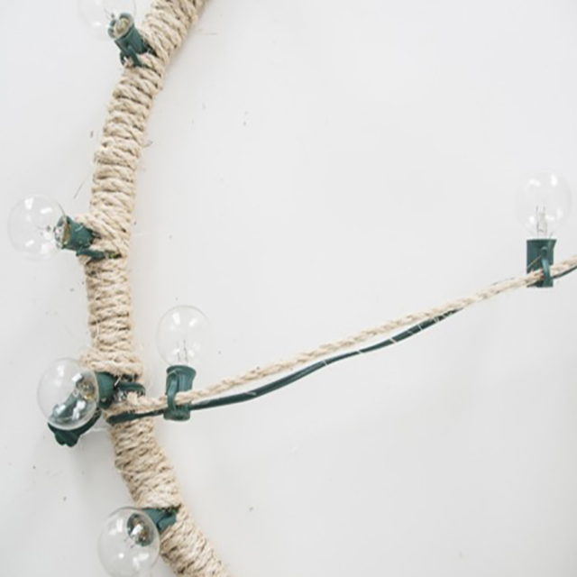 - Envuelve el aro del hula hoop y el cable de las luces con una cuerda.