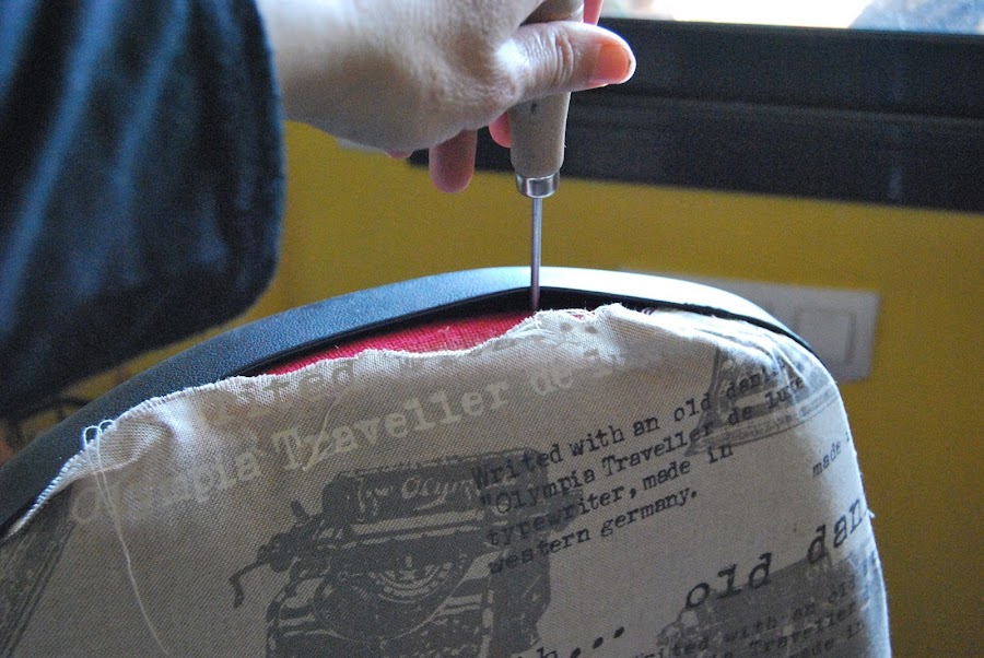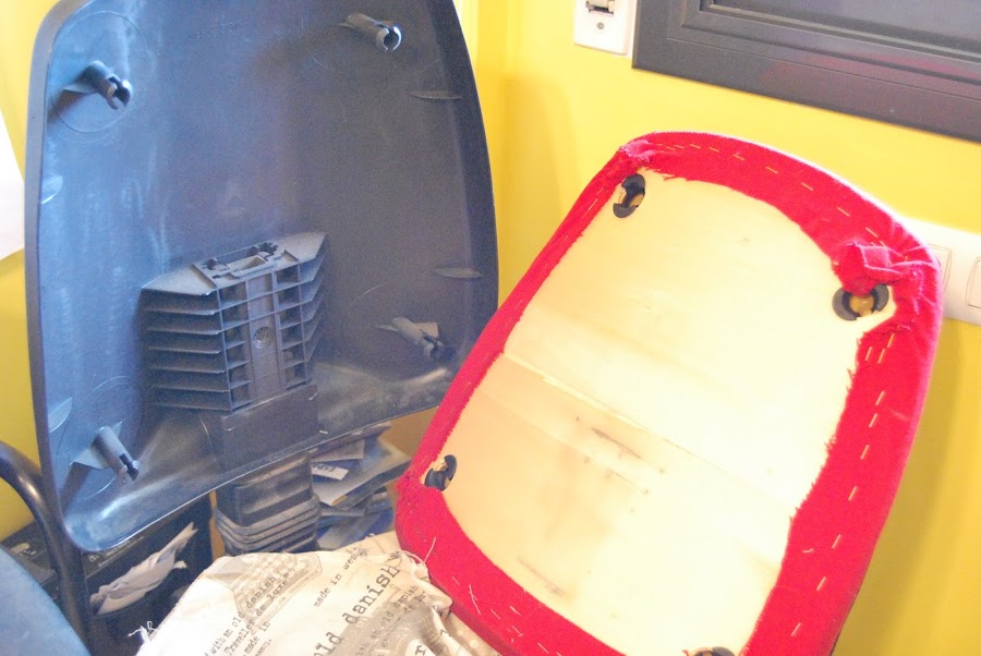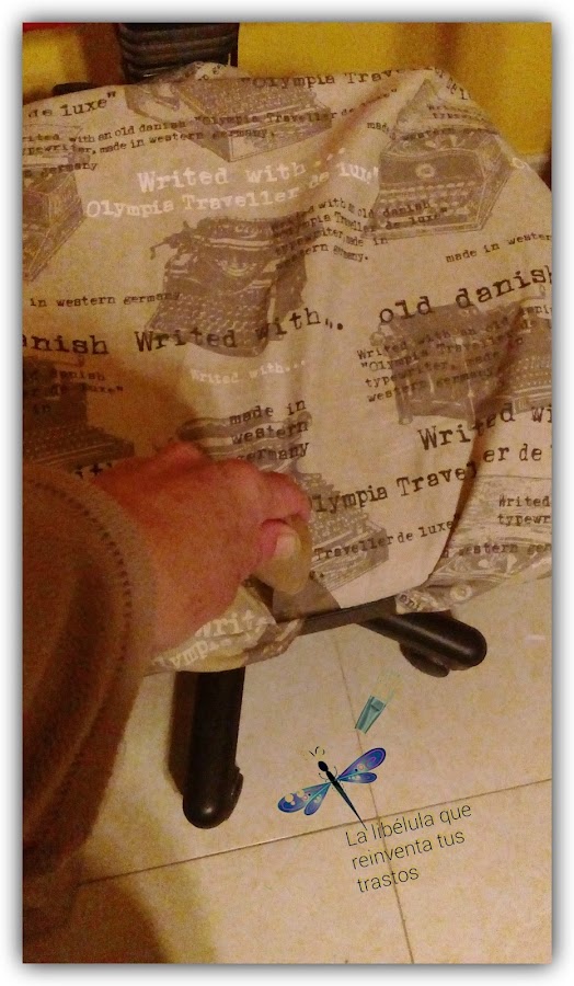 En principìo aquí acabaría el post, porque la silla me quedó muy bien pero, al poco tiempo, me dí cuenta de que de cada cierto tiempo, la tela de la parte de arriba del respaldo, se salía un poquito, menuda chapuza! Y luego ya descubrí el motivo: cuando mi marido se sentaba, como es mas voluminoso que nosotras (que somos cual aves menuditas, jeje!), me bajaba la tela. Así que pasé al Plan B, que es sacar el asiento, grapar la tela,y volver a colocarlo.