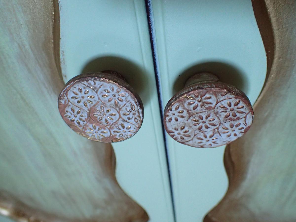 1. En este caso he empezado quitando todas las aplicaciones. Las flores de puertas y laterales eran de madera clavadas con pequeñas puntas y levantando con una espátula salían fácilmente. En cuanto a los pomos metálicos al ir atornillados solo me ha hecho falta un pequeño destornillador.