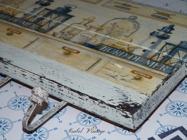 Decoupage con servilleta de estilo marinero o coastal sobre la que he aplicado después varias manos de barniz hasta conseguir su completa integración en los relieves de la madera.