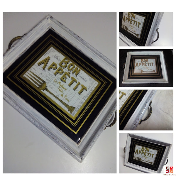 Con la misma pintura dorada y previa imprimación pinté unas asas compradas en los hiper asiáticos, una vez secas (no las he dejado en este color tan dorado, no os asustéis) las coloqué a ambos lados de la bandeja, medí, con un punzón hice los agujeros y atornillé.....fácil no?