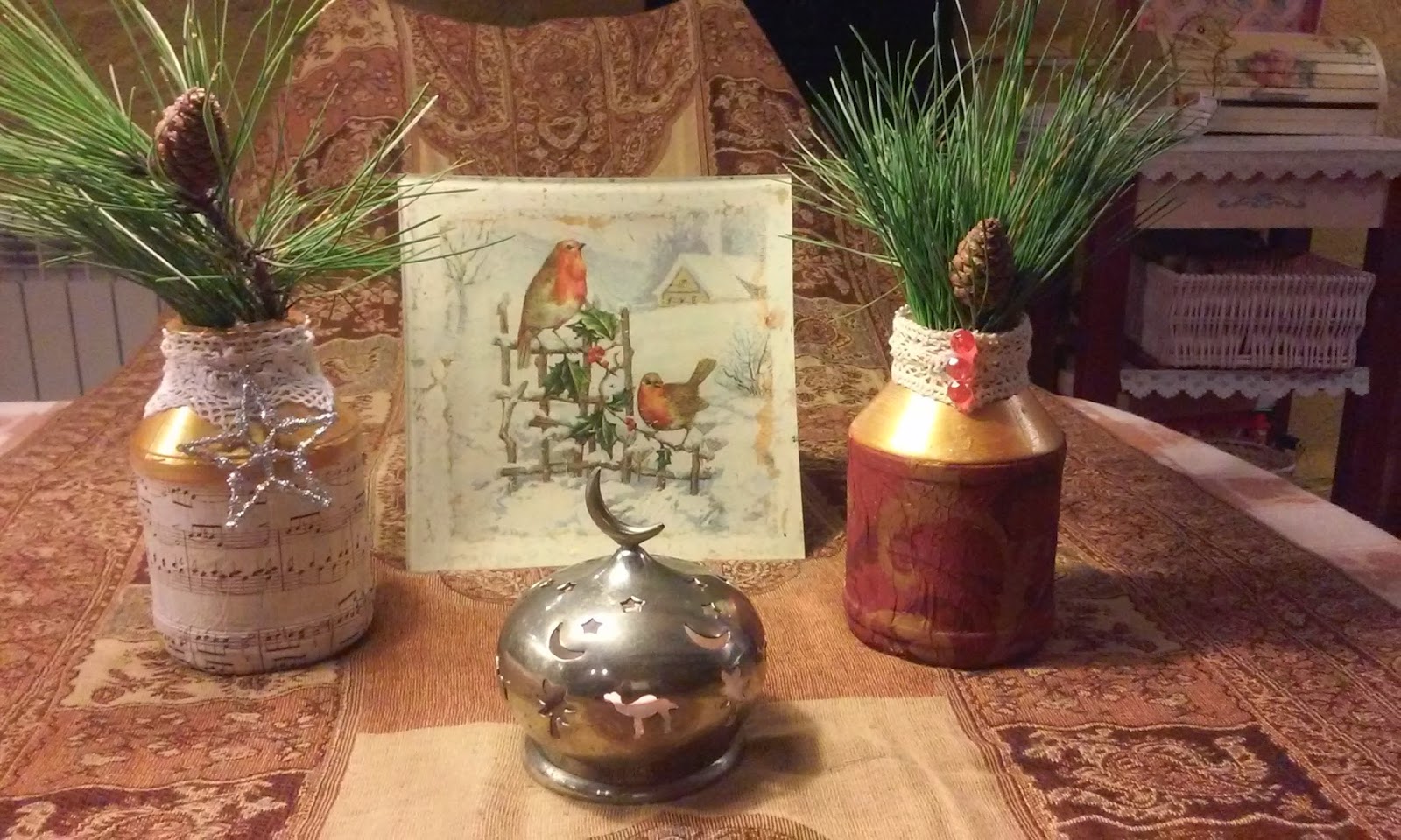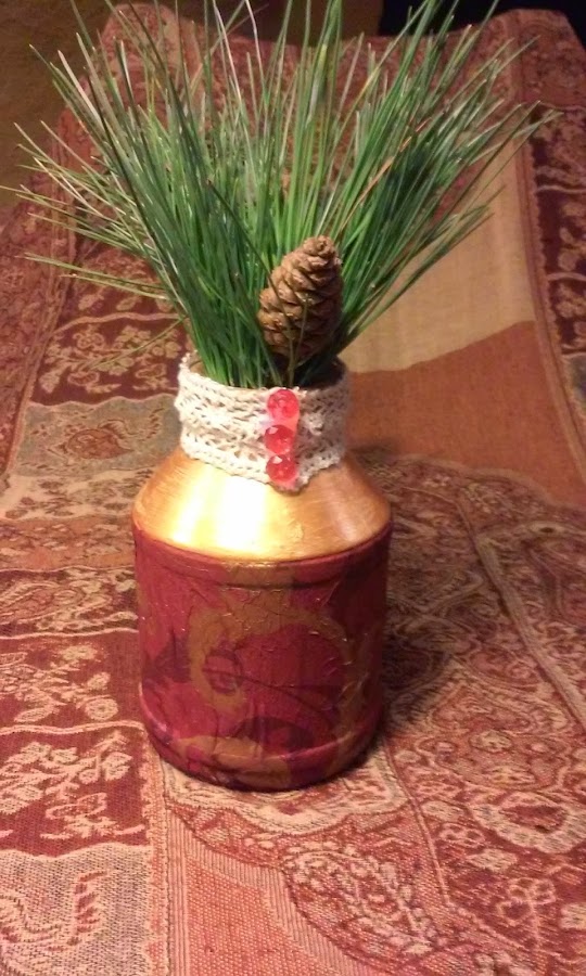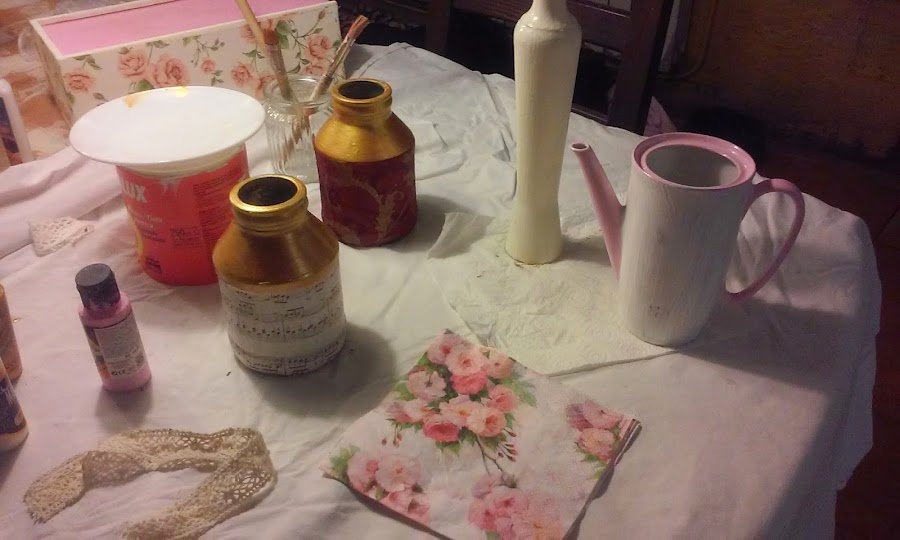 Para las pequeñas mano de imprimación y papel de decoupage, en una color rojo y dorado la otra una partitura, pinté la parte superior en color dorado y pegué el papel, a las dos les he añadido una puntilla en la parte superior, la roja lleva unas cuentas en color rojo a modo de botones para la otra una estrella plateada colgando con un cordoncito para darle un toque navideño. la botella alta simplemente dos puntillas, cinta adhesiva en la parte superior y colgando una flor de madera comprada en los chinorris,la jarra solo lleva una servi y pintura rosa, y para no cansaros mas pongo las fotos y me despido hasta la próxima, gracias como siempre por