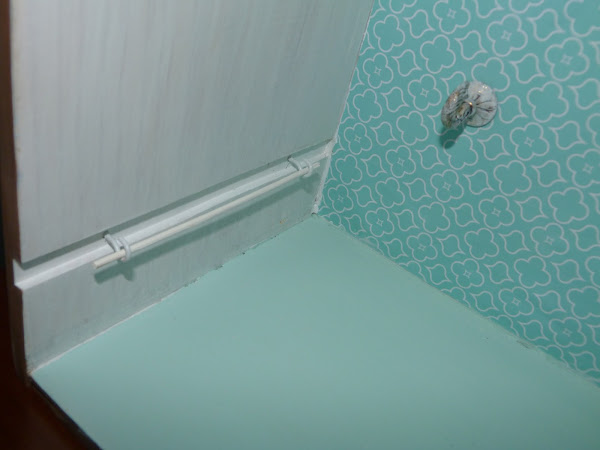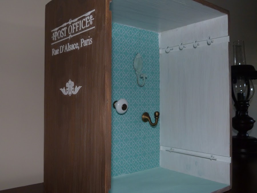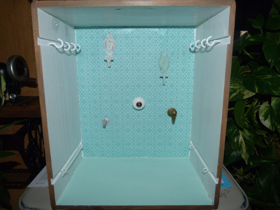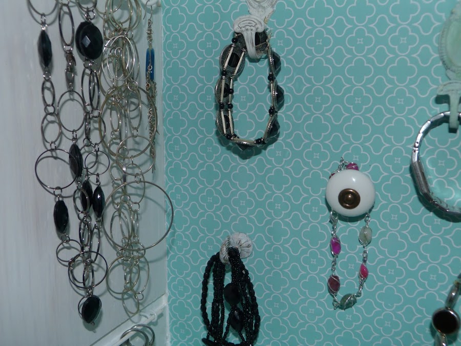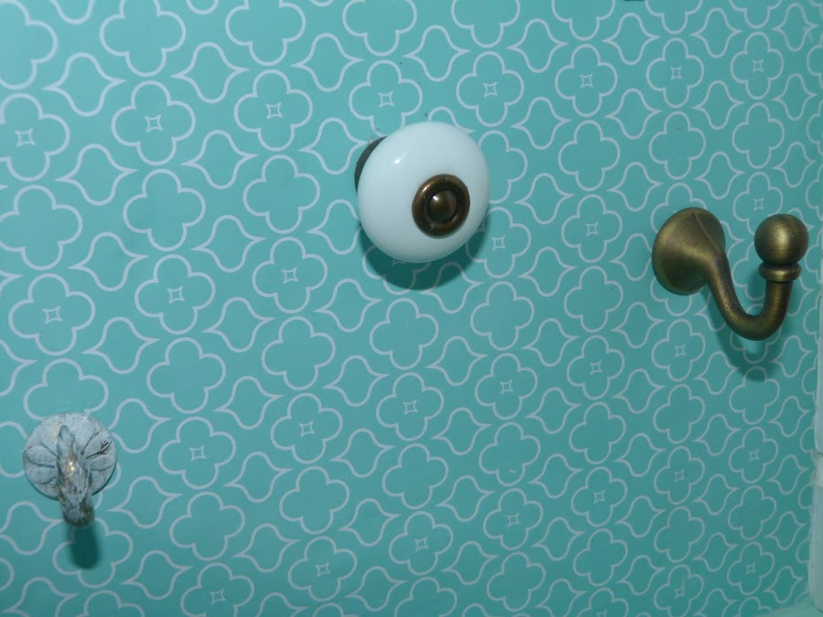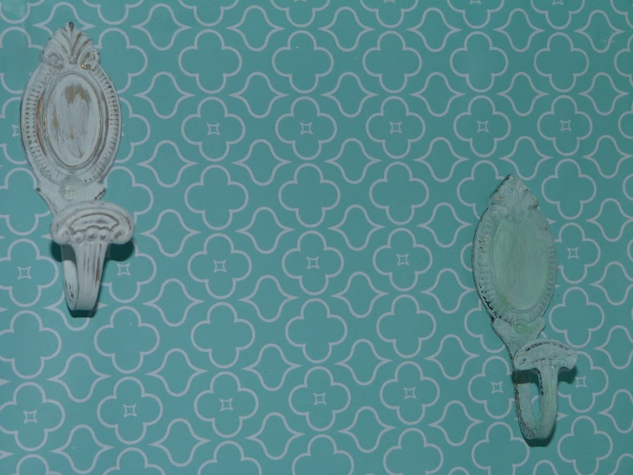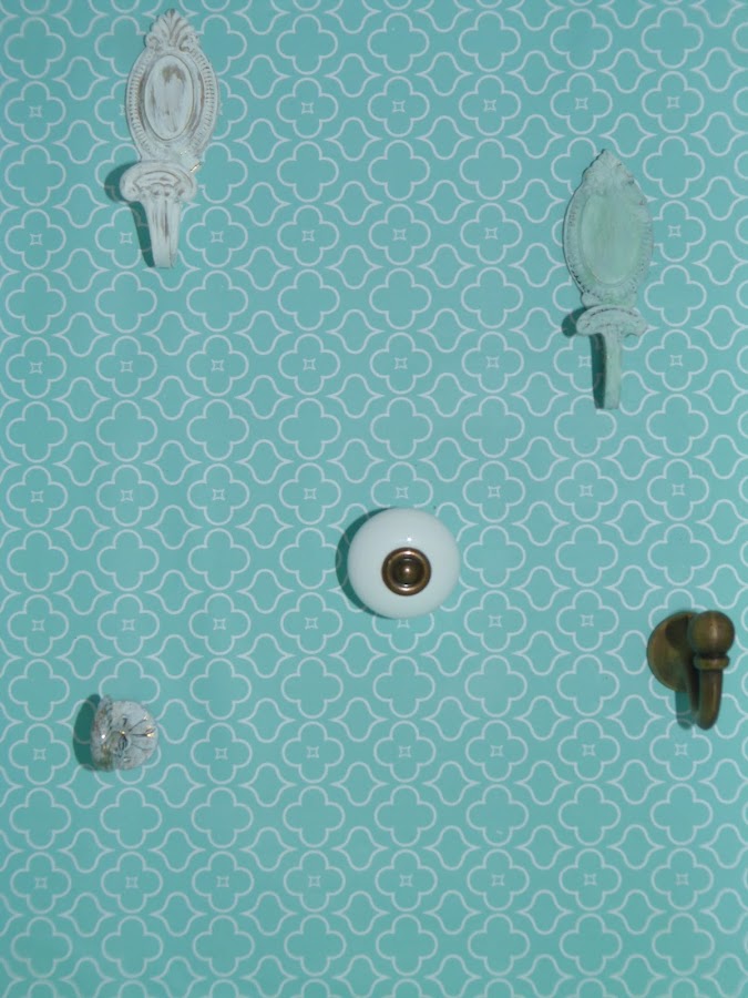 Un bonito papel color aguamarina en el fondo del que será nuestro mueble. Sobre él distintos colgadores, algunos de ellos pintados con chalk paint y después desgastados.