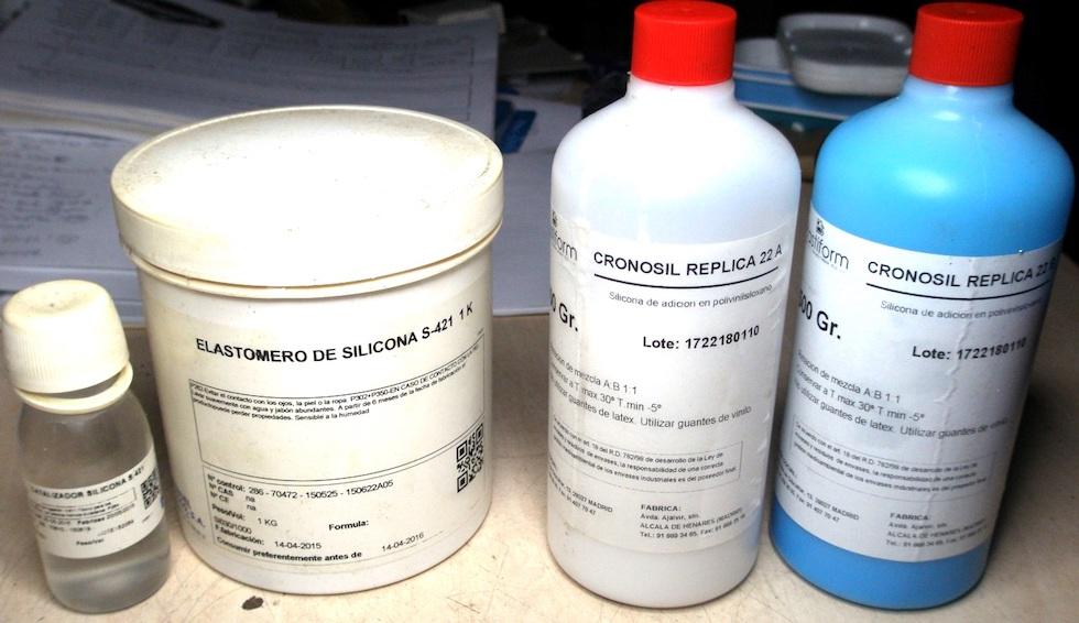 Podemos ver el conocido kit EPOXY, elastómeros de silicona, cronosil y luego veremos la necesidad de otros materiales como pintura al óleo para lograr el color adecuado. Las siliconas son los productos para realizar el molde, mientras que el preparado de Epoxy es el que, una vez tintado, construirá la pieza final.