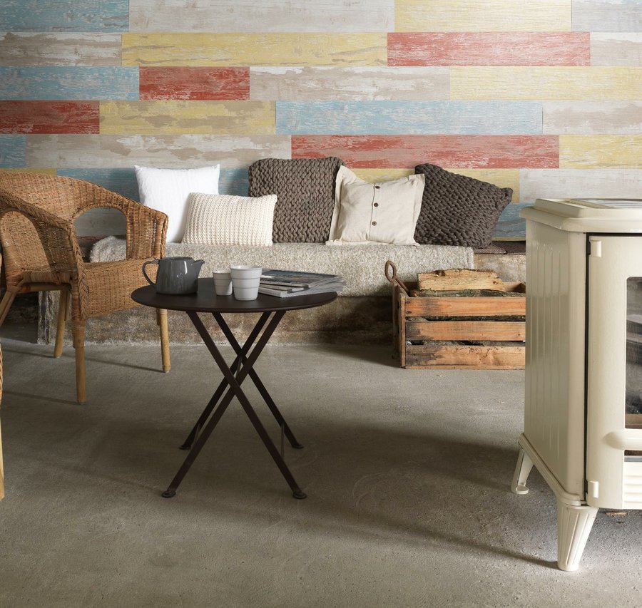 Por su parte, otra de las ventajas del revestimiento vinílico son sus posibilidades decorativas. En concreto, hoy destacamos el modelo Cabane de Grosfillex, que imita el aspecto de la madera, con un precioso efecto desgastado en diferentes tonalidades, que podemos combinar entre sí para crear acabados increíbles. En tonalidades claras y suaves como los amarillos, rojos, azules y tonos naturales, con la veta ligeramente marcada, nos devuelve una estética que se identifica con uno de los estilos del momento, el 'coastal chic', una forma sutil de llevar lo marinero a la decoración.
