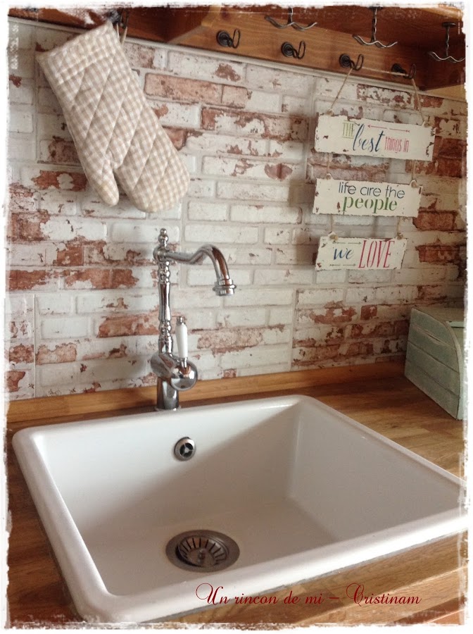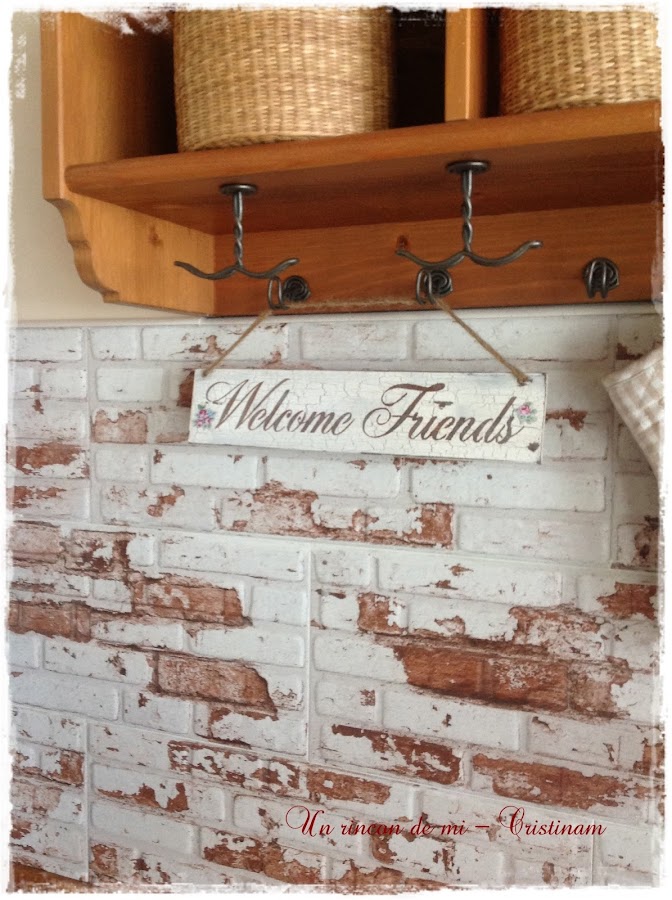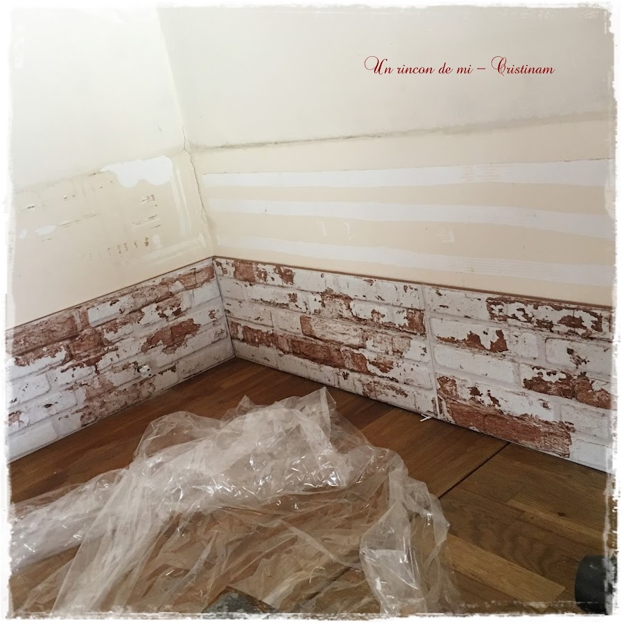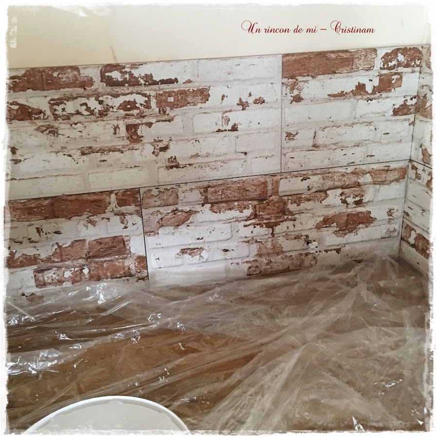 Me decidí por este modelo de azulejo que imita a ladrillo desgastado . Son piezas rectangulares y largas así que con pocas cajas cubrimos todo .