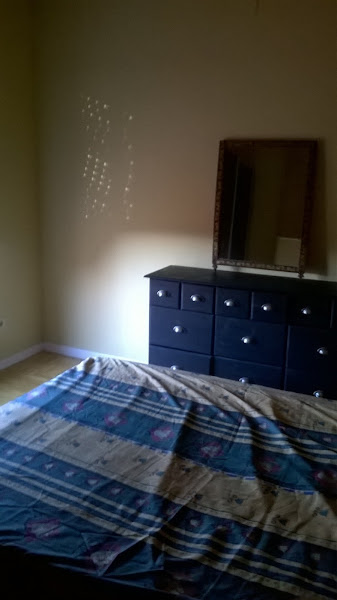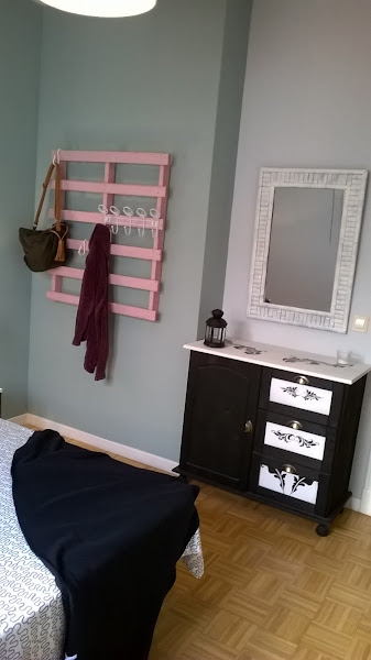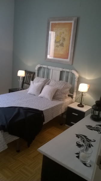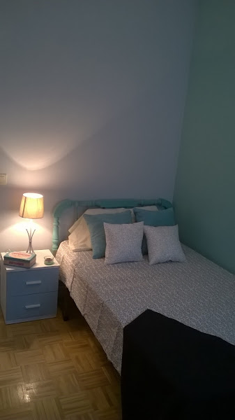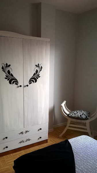 Aquí, a parte de pintar paredes como en el resto, hemos dado una nueva vida al armario, cabecero y mesilla. Los detalles del perchero-palet y la silla turquesa ponen la guinda.