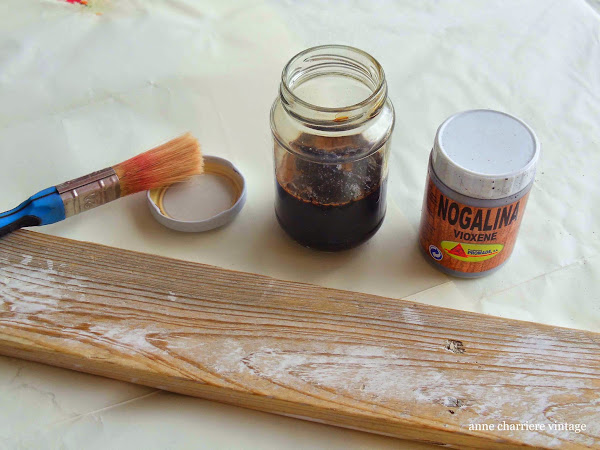 Por cierto, he descubierto el excelente resultado que da la nogalina, el color obtenido para teñir la madera es una pasada! No la solía usar para teñir dado que utilizar más la pintura para todos mis proyectos pero he visto muchos programas de Chus Cano donde la usa y ahora entiendo porqué. Vale un poco más de 1â?¬ en cualquier tienda de bricolaje y se vende en polvo, con lo que tenemos para mucho tiempo. Además, se puede rebajar el tono con agua, ni mancha, ni huele; es genial! Luego, he alternado la pintura de tiza (color Country grey) cada 10 cm con el tinte de base y he ido marcando las mediciones. Para terminar, lo he encerado todo con la cera incolora y la pistola de calor.