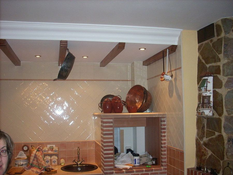 Espacio destinado a la cocina, que ha sido decorado con vigas de madera en el techo. Para el hueco del horno, siguiendo la traza rústica, nuestros amigos optaron por el ladrillo macizo.