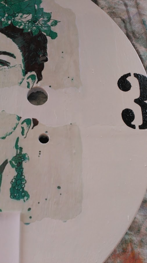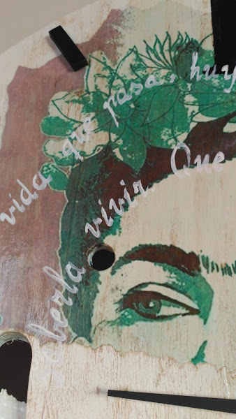 Me hice con una de tantas y tantas imágenes que rulan por Internet de Frida. Me gustó para lo que quería hacer, que no era más que romperla en trozos para conformar los cuartos de lo que sería el reloj. Como un collage.