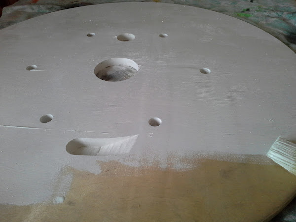 Para el trabajo en cuestión partimos de uno de los laterales de la bobina de cable cuya base pintaré en blanco. Sin lijar y además con pintura a la tiza bastante solidificada (pues ya tenía cierto tiempo y comenzaba a secarse) darle cierta rugosidad y relieve.