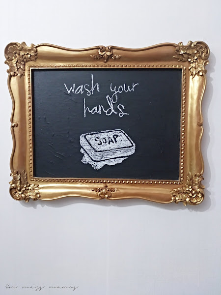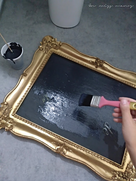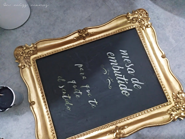 Tenía unos cuadros que reciclé una vez con pintura pizarra para la decoración de una boda y que estaban dando tumbos por el taller, así que volví a reciclar uno de ellos con más pintura pizarra casera.