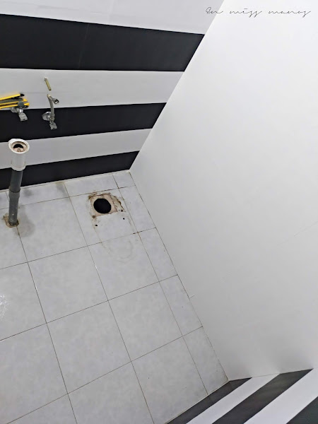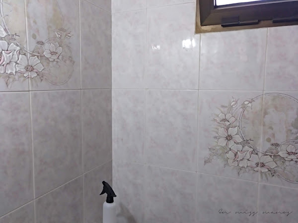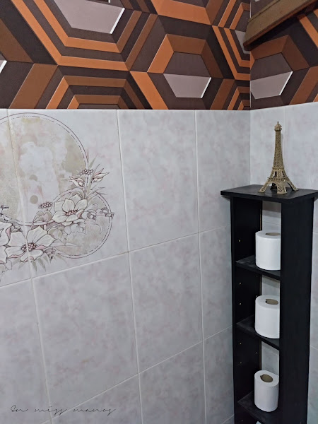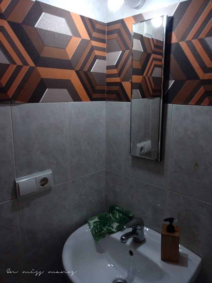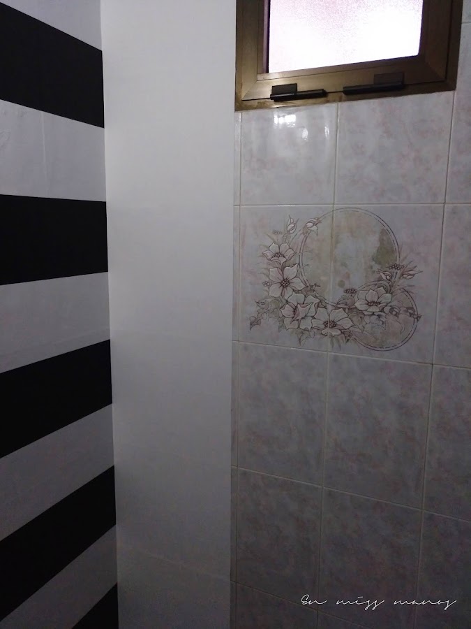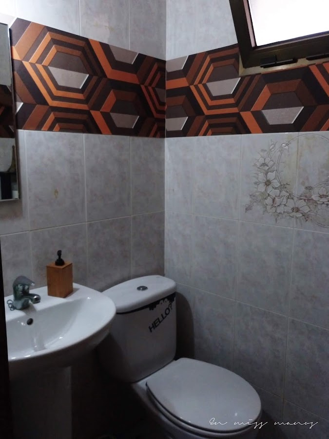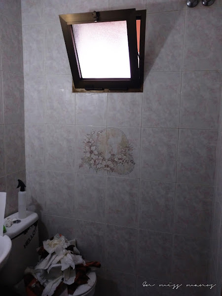 A parte de los dibujos, los azulejos no son cómo en el cuatro de baño grande, marmolados con tonos grises, sino en tonos rosas, que qué queréis que os diga, pero eran espantosos...Por ello tenía o la opción de empapelar o de pintar.