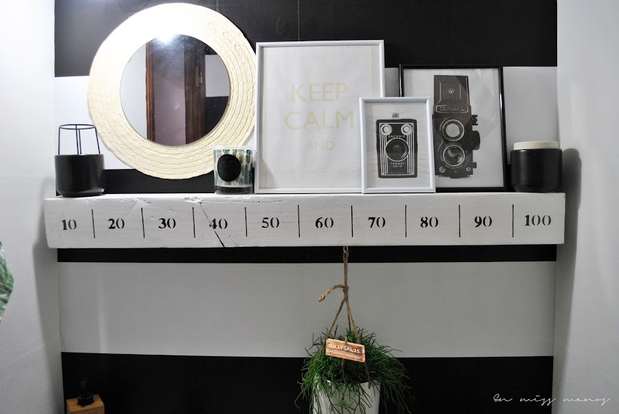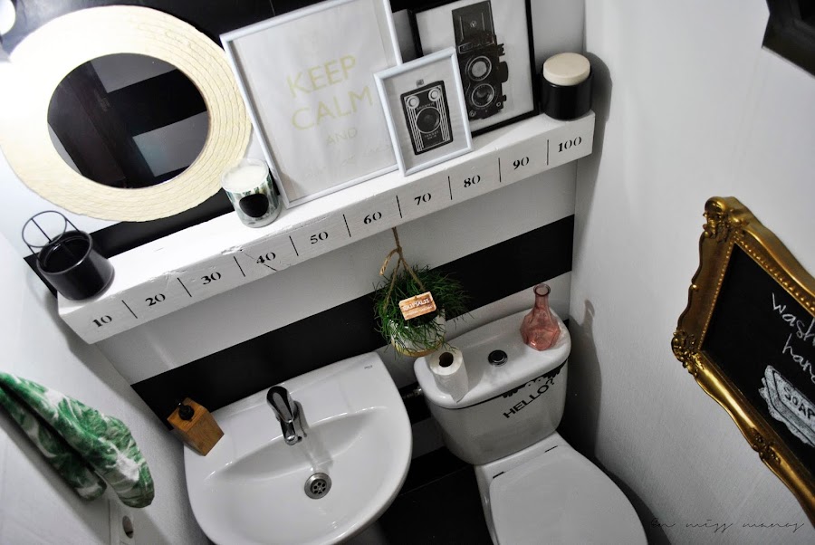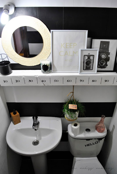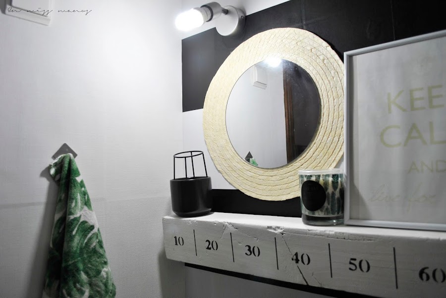 Encima del lavabo y el inodoro coloqué como estante un listón que hice hace ya cuatro años y que también podéis ver aquí . Simplemente lo acorté unos 30cm, pero quería aprovechar al máximo las cosas que tenía en casa sin usar para poder decorar sin comprar nada.