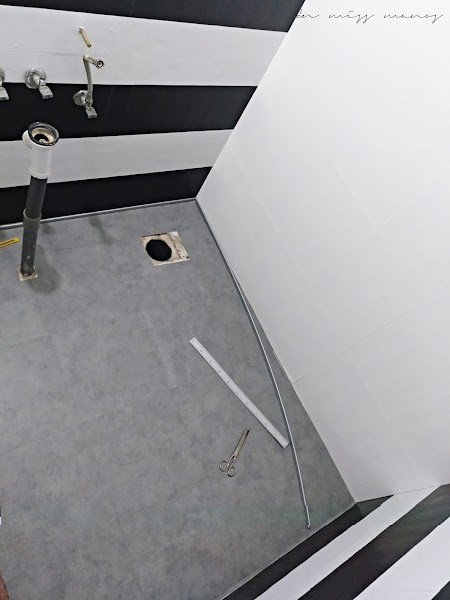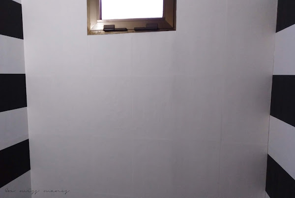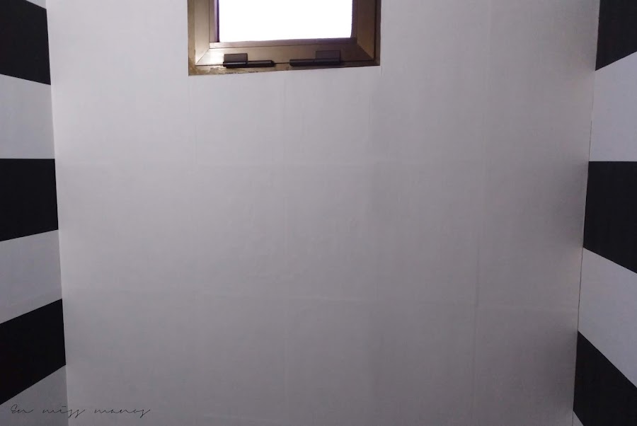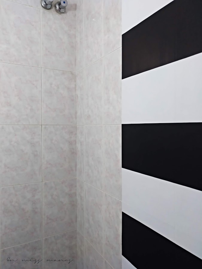 Una vez lavados todos los azulejos de arriba a abajo, empecé a empapelar con el papel de rayas, que encima conseguí en una sección de saldo de Leroy merlín ¡por cinco euros!
