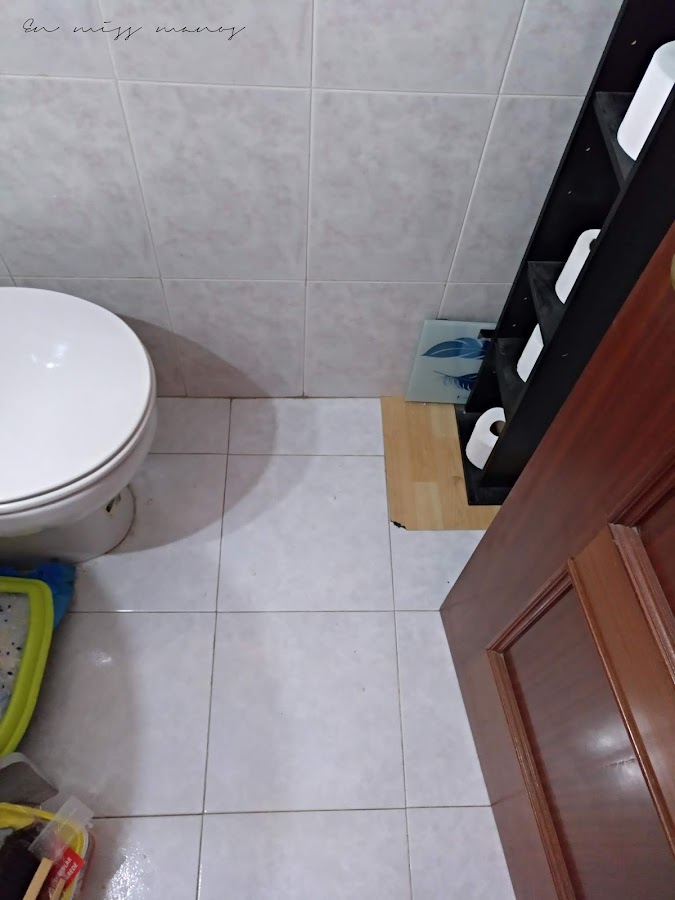 Una vez empapeladas las paredes el tema del suelo fue rapidísimo. Tardé una hora en cambiarlo, porque además se tuvieron que quitar el lavabo y el wc para facilitar el trabajo, y eso hizo que fuera mucho más sencillo de pegar sin estar recortando con las formas, como la anterior vez.