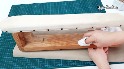 Yo no le quitaré esta base porque esto implicaría quitar y poner clavos, además considero que así como está, está muy bien. Lo que sí voy a hacer es limpiar esta parte textil con una espuma especial de tapicería que es como limpiar en seco.