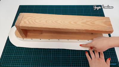 El patrón yo le he hecho dibujando la base de la mesita en un trozo de papel, así como ves en la imagen de abajo. A esto le he marcado 4 cm por todos los bordes que nos serviran para cubir toda la base.