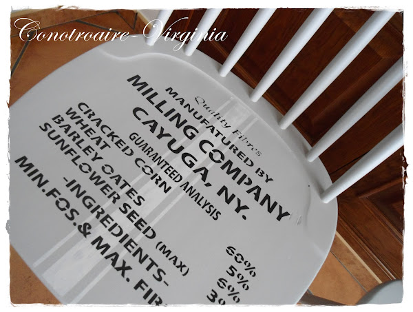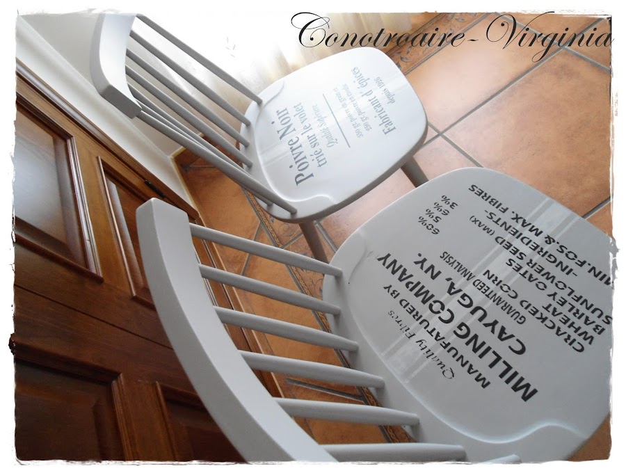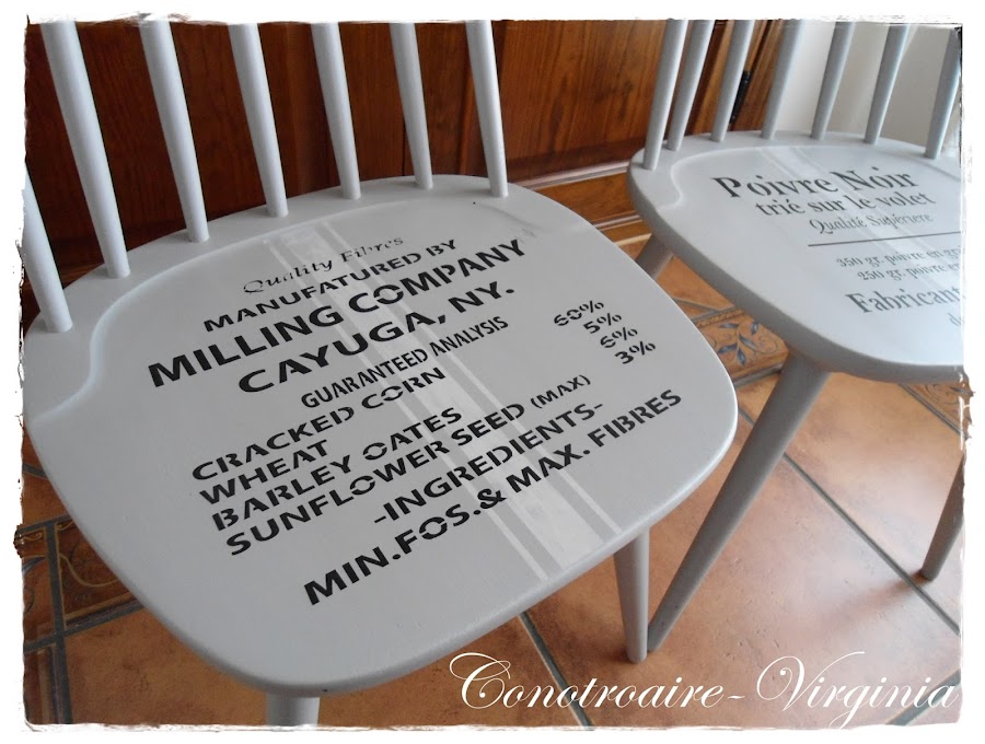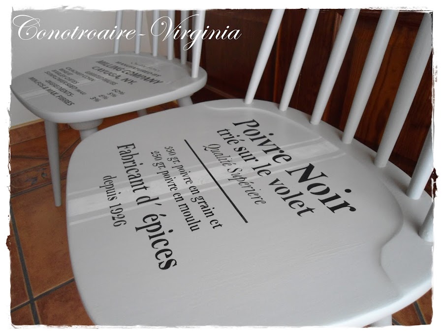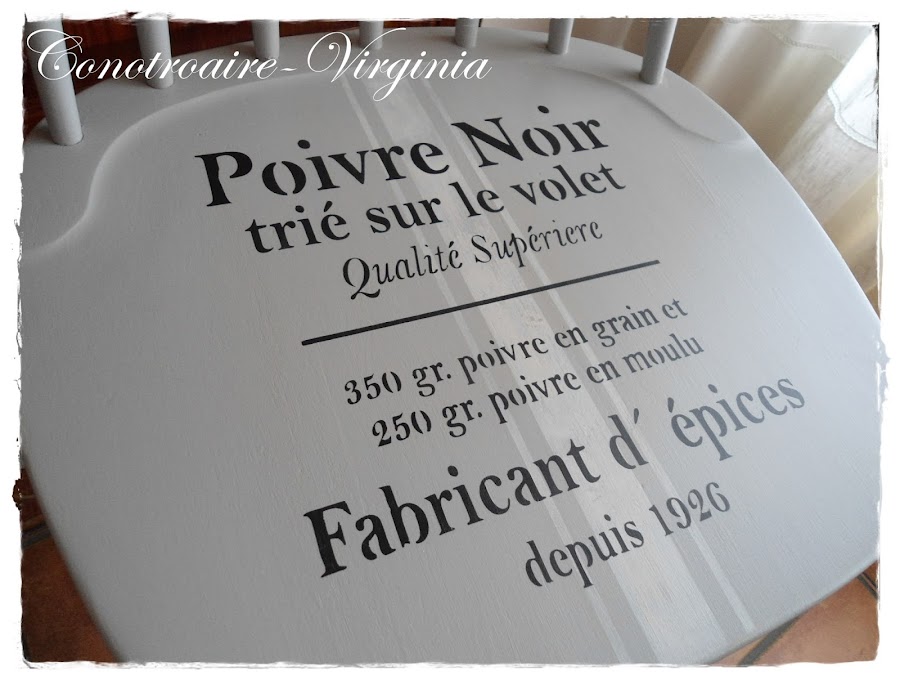 Con stencils, he decorado el asiento, las rayas desgastadas en color piedra y el texto en color negro.