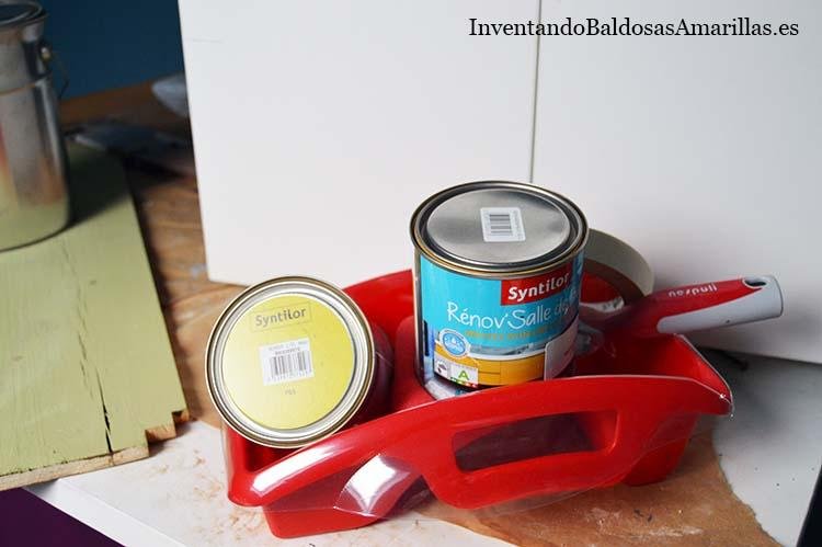 Ahora sí! Sacamos el rodillo y nos ponemos con la pintura para decorar nuestro mueble del baño. Movemos bien la Pintura Decorativa Multisuperficies Renov’ porque tenemos que asegurarnos de que el color es homogéneo y se mezcla bien los componentes. Hace unas semanas descubrimos el agitador de pintura de Nespoli y aunque es una herramienta de una enorme simplicidad creemos que tiene una utilidad tremenda. Sus agujeros permite mover la pintura sin meterle aire y así no tiene burburjas. Una cosa que, por cierto, me han preguntado varias veces. ¿Por qué salen burbujas cuando pinto con el rodillo? O porque has disuelto demasiado la pintura o porque al agitarla ha entrado aire.