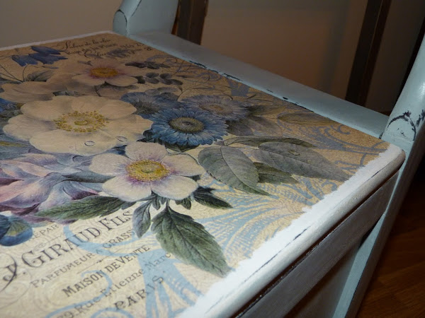 Después de integrar bien el papel en la madera, lijando los bordes y fusionando mediante toques de pintura, y dos manos de barniz mate incoloro, el asiento del banco está perfectamente protegido para poderlo utilizar sin problemas.