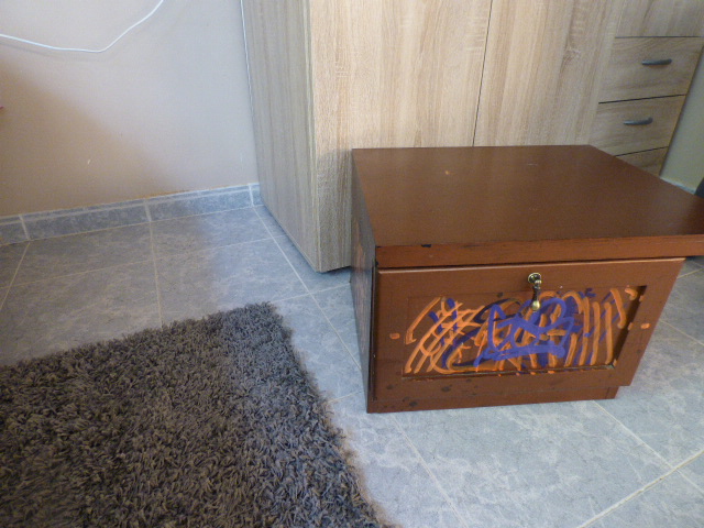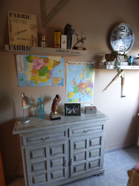 El caso es que para amueblársela tenía que apañarme con lo que había por casa y he recurrido a tunear un mueble castellano del año catapún y una mesita que tenía también por aquí.