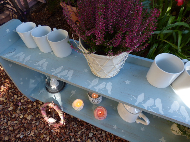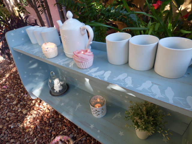 Los pajaritos tenían que ir muy al borde del estantito porque esta estanteria está normalmente colgada de la pared a la altura de los niños, para que ellos puedan dejar sus vasitos. Los vasos no debían tapar los pajaritos......