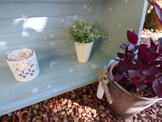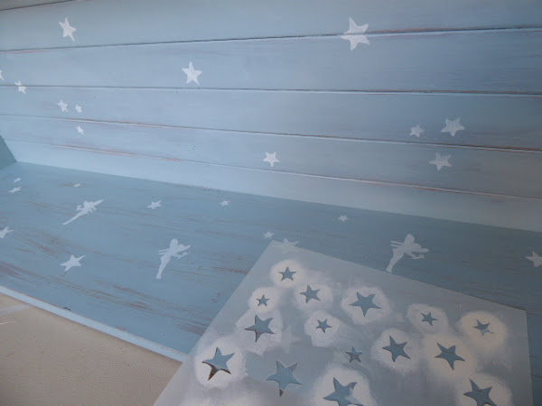Los estarcidos están hechos con un color crudo y sin insistir mucho con la esponjita para que no quedaran demasiado claros.....
