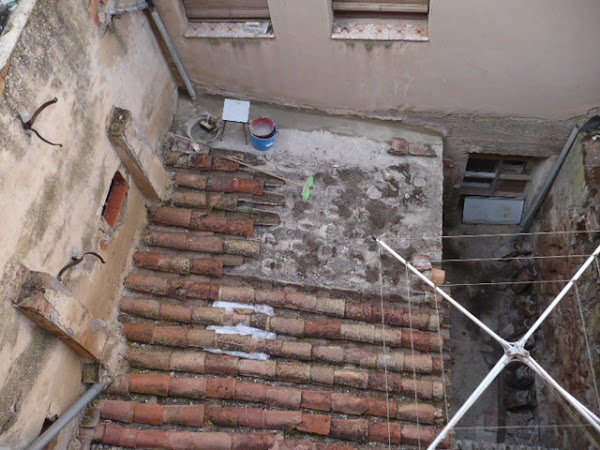Para mas lió, el verano a sido muy tormentoso, así que tendría que ir haciendo las reparaciones, mientras quitaba las tejas. El encuentro entre la fachada derecha y el tejado, lo he repasado con cemento rápido, procurando que penetre bien entre las dos superficies.Después pongo masa, dejando una media caña, para que el agua tenga mas facil caer sobre el tejado, que introducirse entre el tejado y la fachada. Esta masa esta dentro de una roza que he hecho en la pared. En realidad solamente he levantado el revoco, porque la pared es de hormigon, pero el revoco tiene bastante profundidad.
