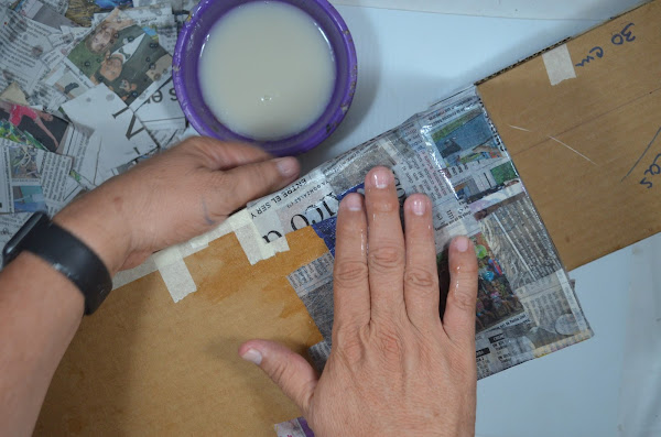 Hacemos cartapesta a todo el trabajo con papel de periódico y engrudo casero, le damos dos capas dejando secar entre capa y capa.