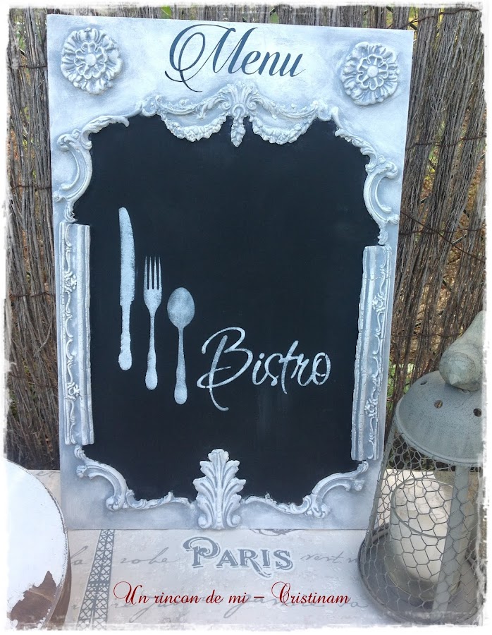 Protejo toda la pieza de molduras y exterior de la pizarra con cera y pongo un vinilo negro con la palabra Menú en la parte superior.