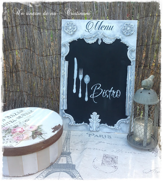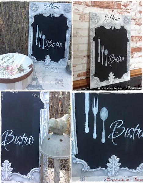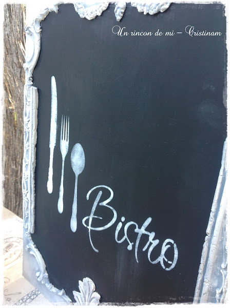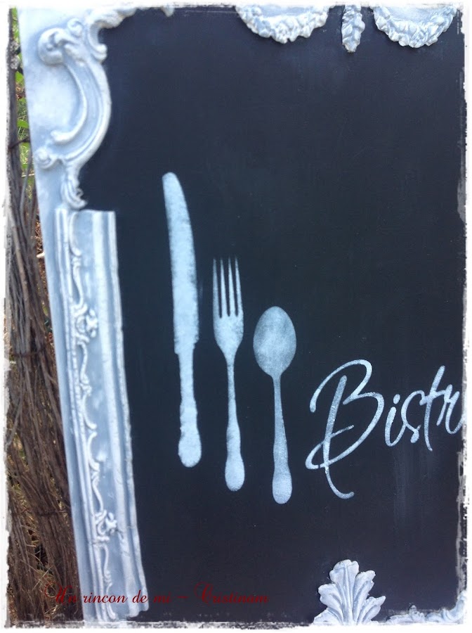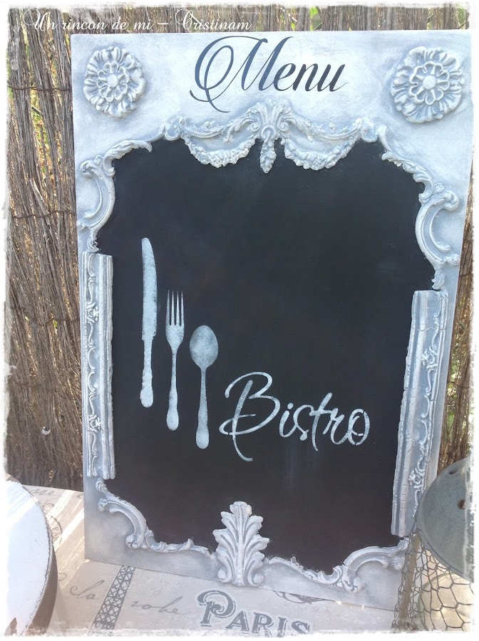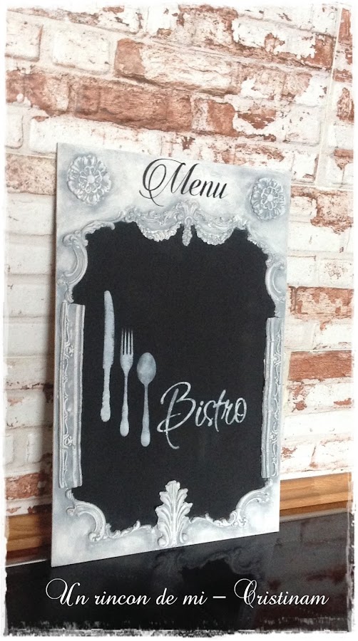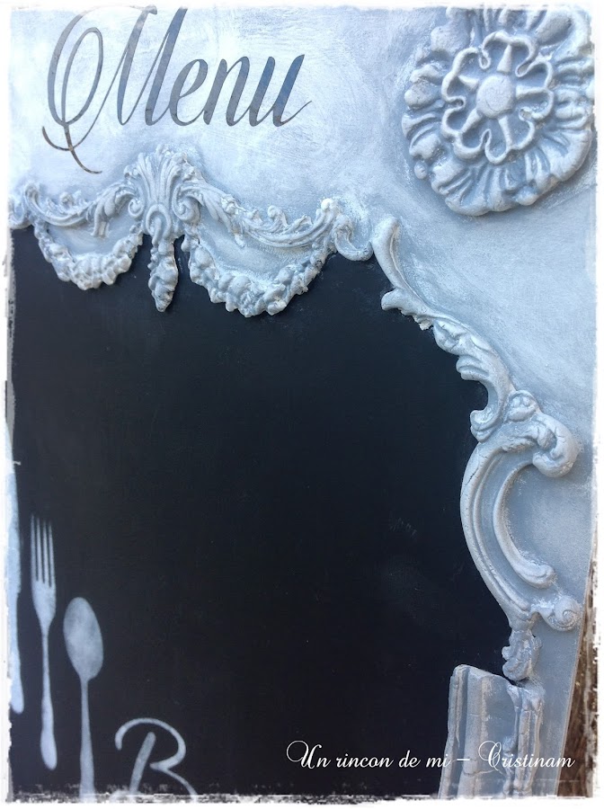 Protejo toda la pieza de molduras y exterior de la pizarra con cera y pongo un vinilo negro con la palabra Menú en la parte superior.