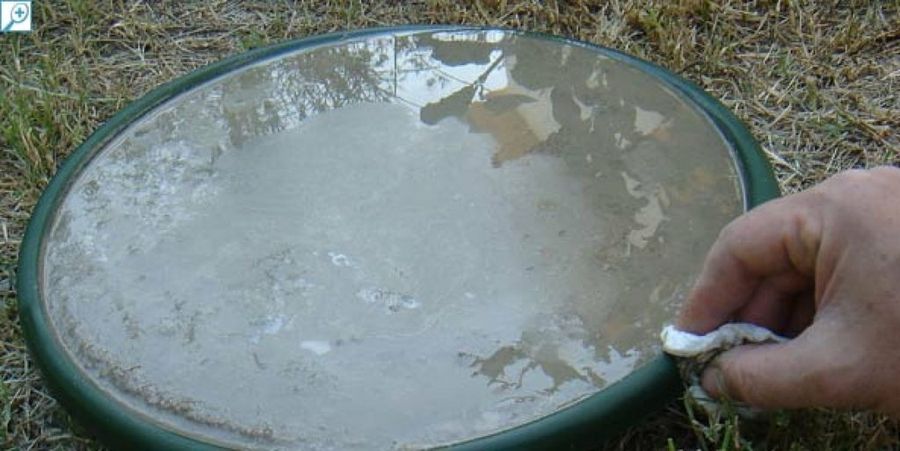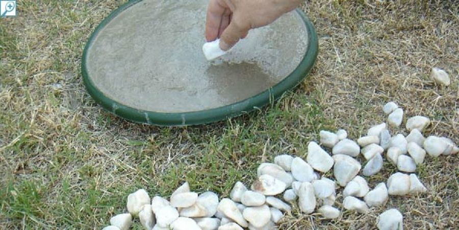 Para que el borde de nuestra loseta salga perfecto y liso, con un trapo limpiamos de mortero el contorno del plato. Antes de poner los guijarros dejamos que pase media hora, más o menos.