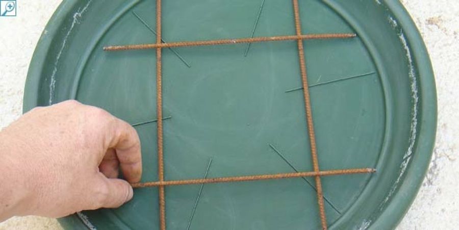 Presentamos la cruceta en el molde, comprobando que no toca los bordes. Una de las normas del hormigonado es que las armaduras queden perfectamente sumidas en el hormigón, para evitar las oxidaciones. El molde es un plato de plástico, de los que se ponen debajo de las macetas.