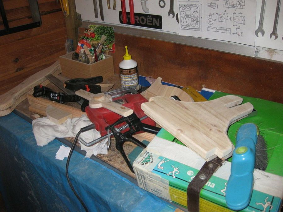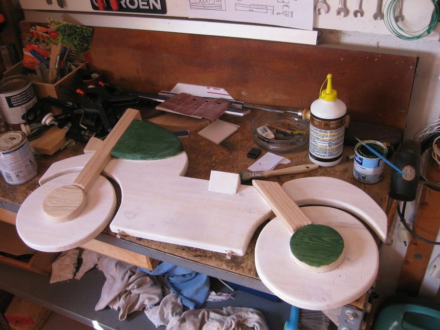 Nuestro amigo Ytuhu decidió fabricar su moto balancín siguiendo los planos de Maricualquiera, una experta en ese tipo de juguetes. El material elegido fue el tablero alistonado. ¡Qué grata visión este banco de trabajo con todo dispuesto para abordar la tarea, y el plano delante para consultarlo en todo momento!