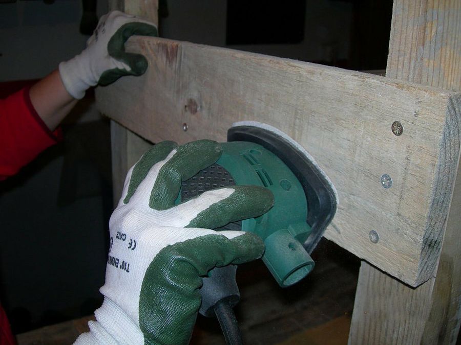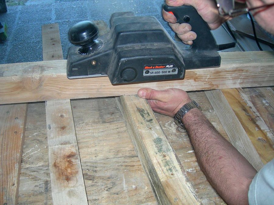 Thediva escoge los travesaños más gruesos de los palets para hacer las patas de la mesa. Después de cortarlas a la altura deseada, utilizan una cómoda herramienta para igualar la madera, la cepilladora eléctrica.