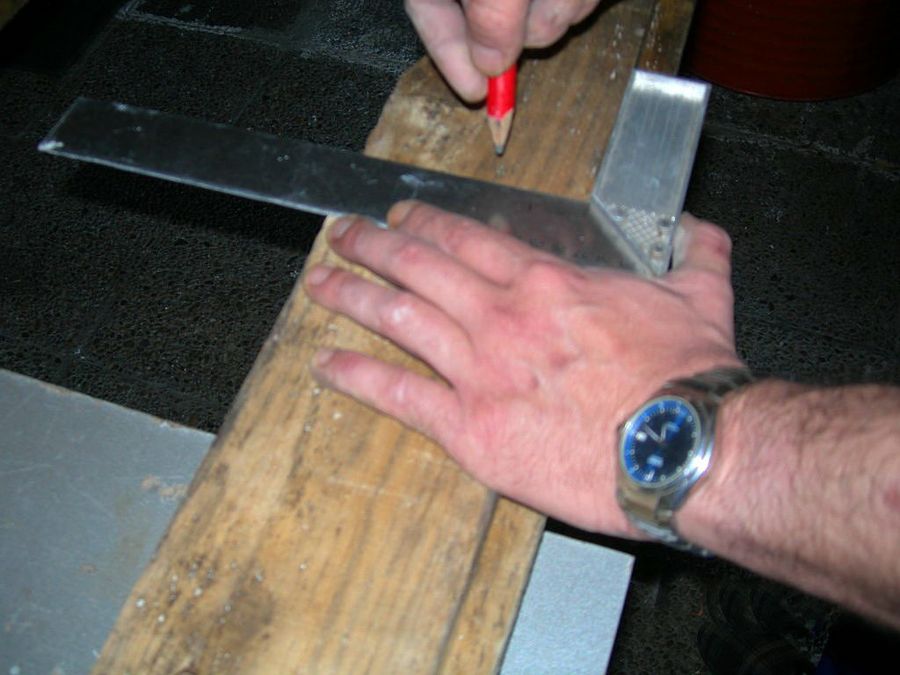 La escuadra es nuestra fiel aliada en todo proyecto de carpintería. Aquí el ayudante de la artista mide y marca las tablas más ‘distinguidas’, que formarán el sobre de la mesa.