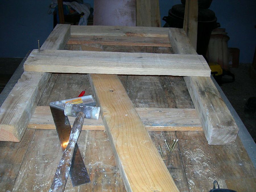 Con las tablas ya igualadas y cortadas, se atornillan tres listones de refuerzo por debajo.
