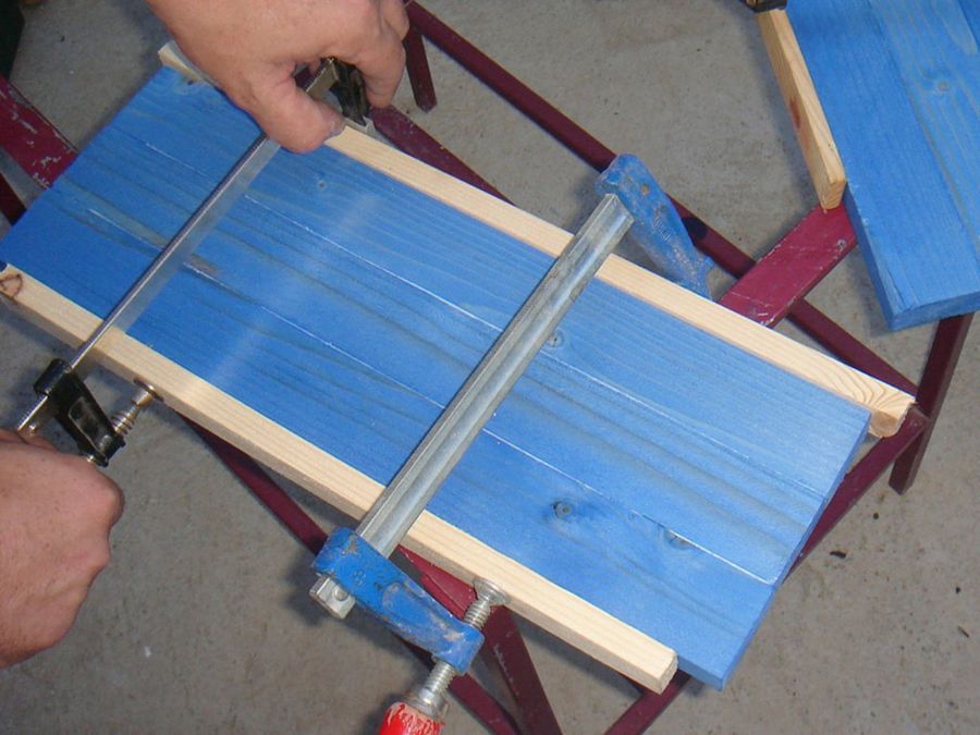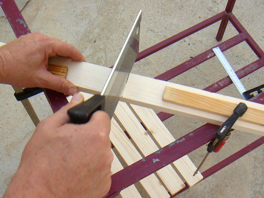 ¿No tenemos banco de trabajo? Eso no es problema para un bricolega solvente, utilizamos esta mesa de terraza con armazón metálico, una vez retirado el cristal. Apoyamos el pie en el travesaño inferior, y la mesa no se moverá con el vaivén del serrucho.