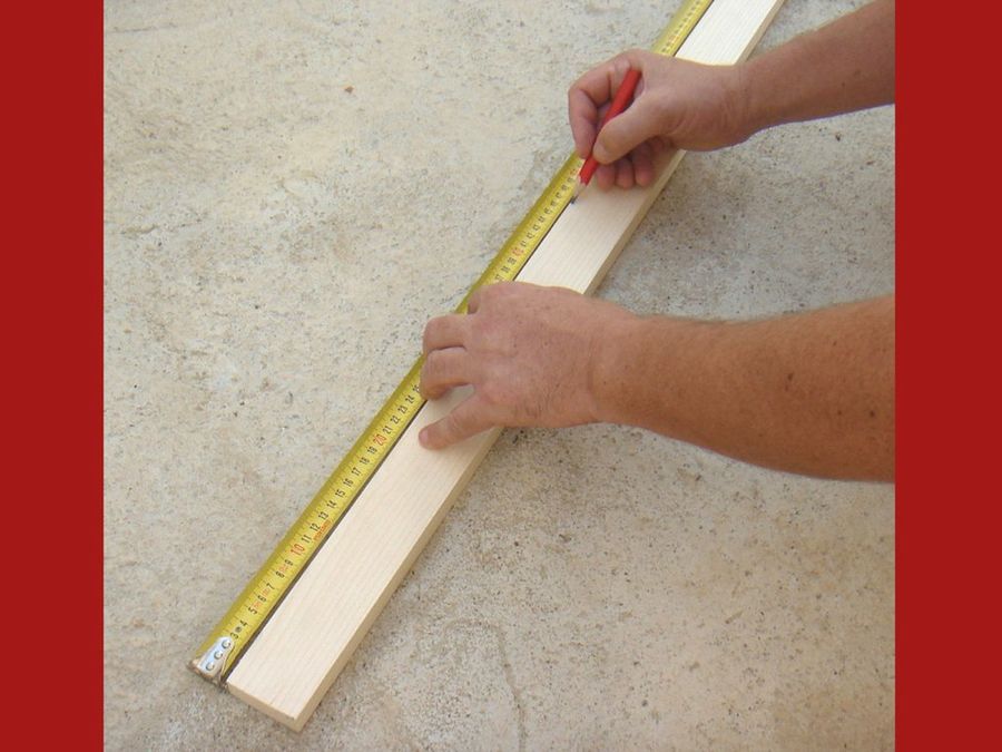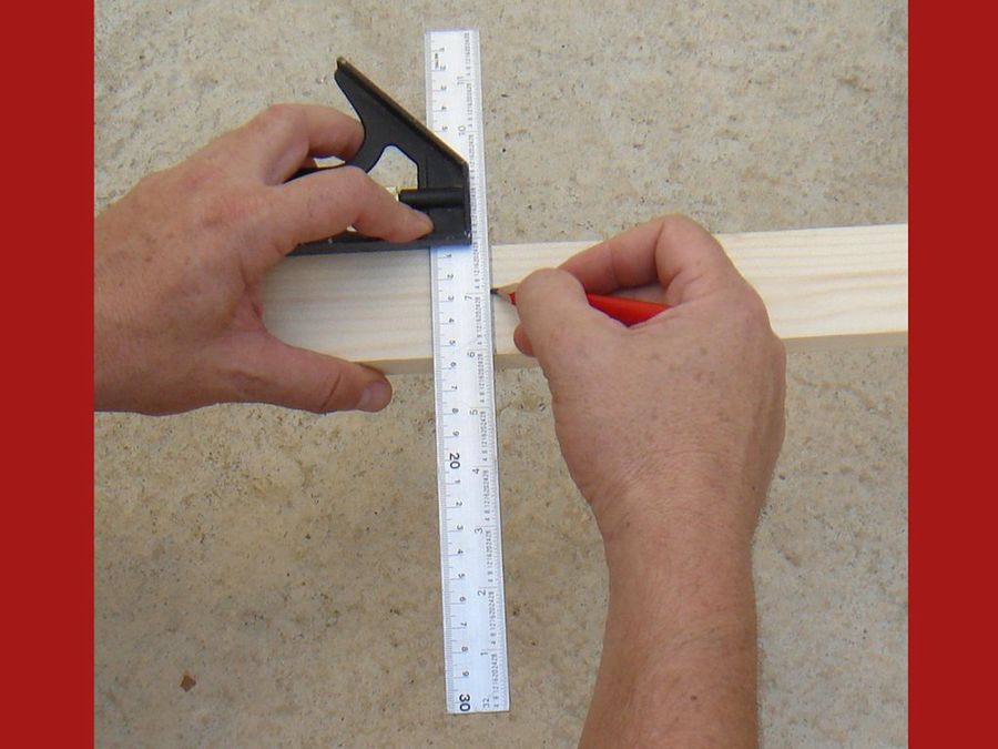 Dado que el listón venía cortado de fábrica, ambos lados son rectos y paralelos. Podremos entonces obtener fácilmente las marcas a 90º mediante la escuadra, una de las herramientas imprescindibles en carpintería.