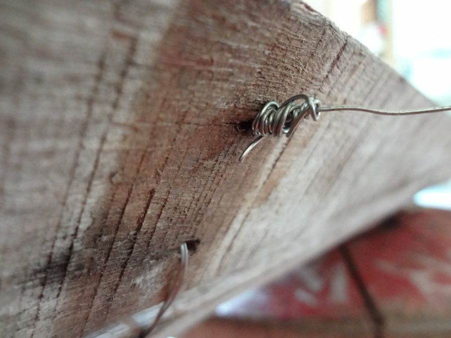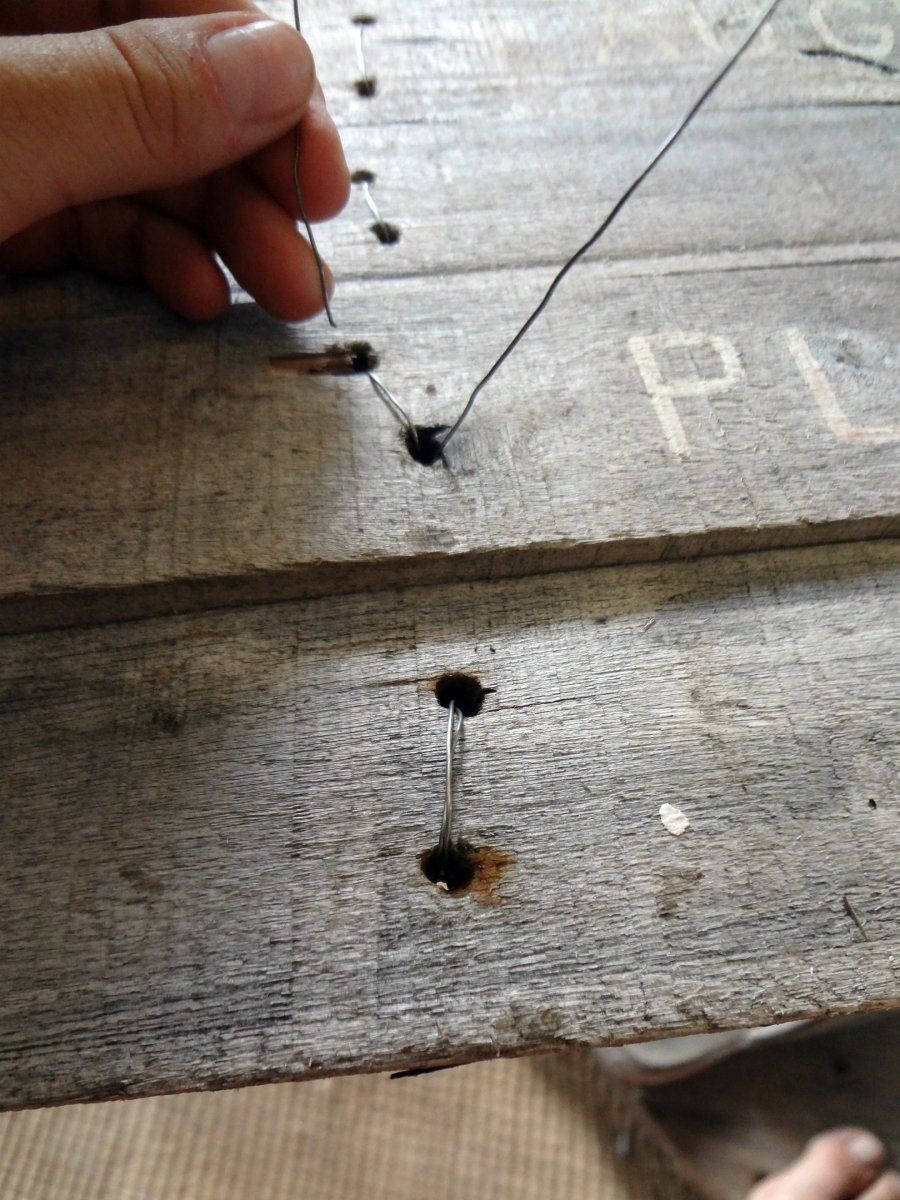 Una vez se haya secado la pintura, sólo nos quedará unir las tablas. Para ello realizaremos agujeros por los que introducir hilo de alambre. Podemos seguir los agujeros de los clavos como guías o realizar nuevos. Así, debemos entrelazar el hilo para unir las tablas y listo.Agradecimientos: Idea y fotografías de Pallet Web