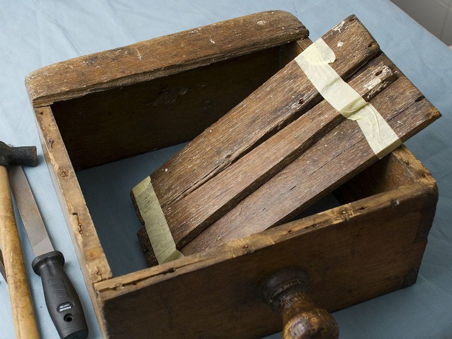 Vamos con los preparativos en el celemín, que ya hemos limpiado meticulosamente. Encolaremos las tablas del fondo, que venían clavadas, y presentaban holguras debido a la ruda manipulación durante años. Queremos eliminar los clavos para evitar arañazos en el mueble donde pongamos nuestro celemín, convertido en revistero. Cortamos los clavos fácilmente, insertando entre las tablas la hoja de una sierra para metal. La tabla del fondo se había partido, y para evitar extravíos precintamos las piezas con cinta de carrocero.