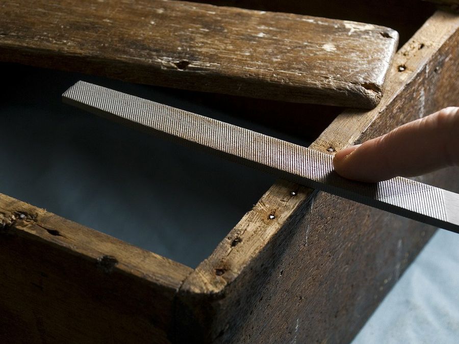 Dada la dureza de la madera, no conseguimos hundir el trozo inserto de los clavos con el botador. Aunque en principio encajarán en los correspondientes agujeros de las tablas, los rebajamos cuidadosamente con la lima para metales, procurando no arañar la madera.