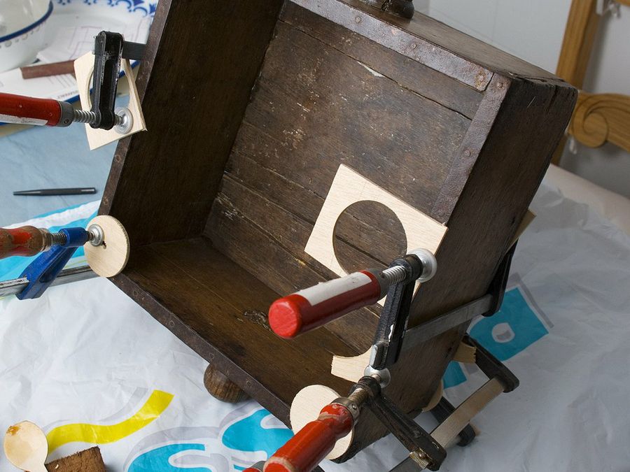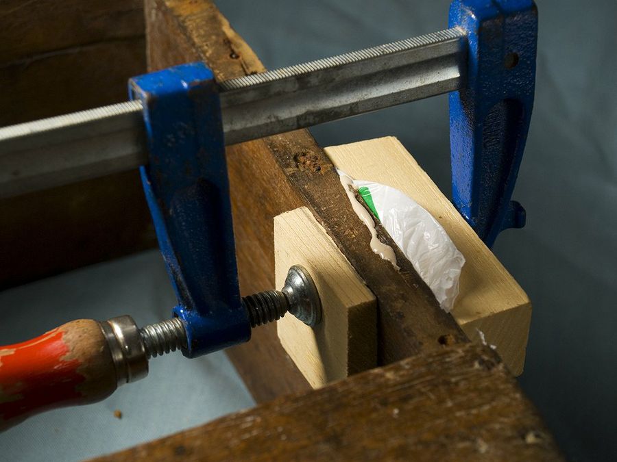 Aunque la madera de encina es muy dura, colocamos unos recortes de marquetería para evitar que las mordazas dejen marcas en la superficie. Nuestro experimento con cola de conejo ha sido altamente satisfactorio, y algunas horas después comprobamos otra ventaja de los pegamentos naturales: los goterones que han rezumado de las uniones se retiran con gran facilidad.