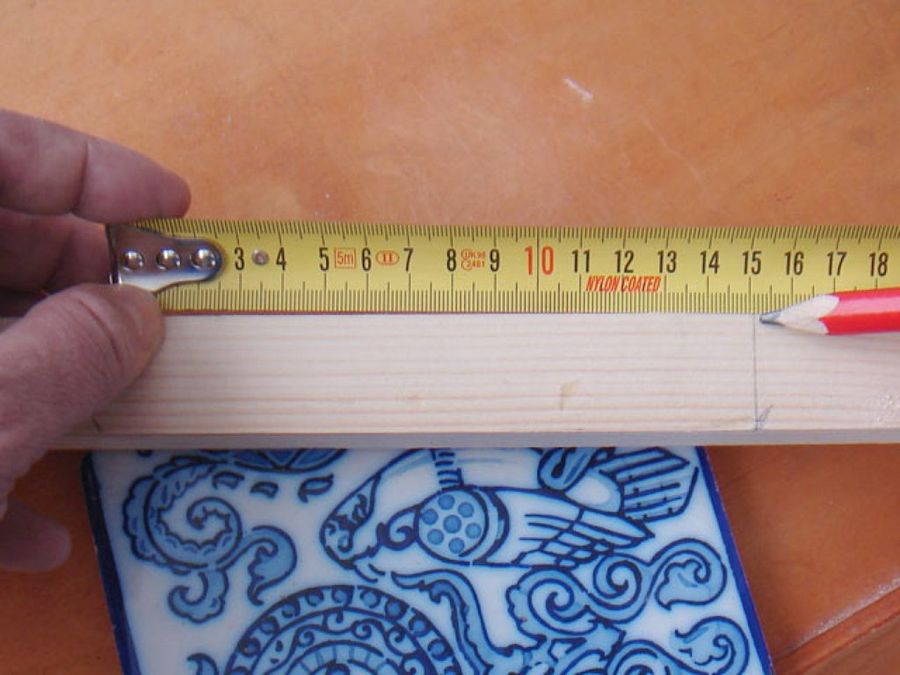 Para hacer el salvamanteles es necesario que uses el azulejo que ha de quedar perfectamente inscrito en el marco de madera, de modo que realizamos una cuidadosa medición. Como el azulejo mide 15 cm de lado, daremos 1 milímetro más a cada lado del listón.