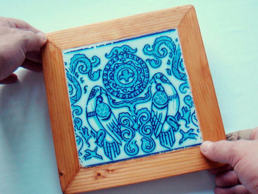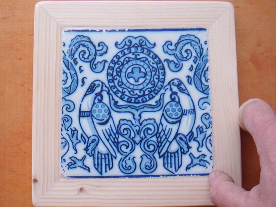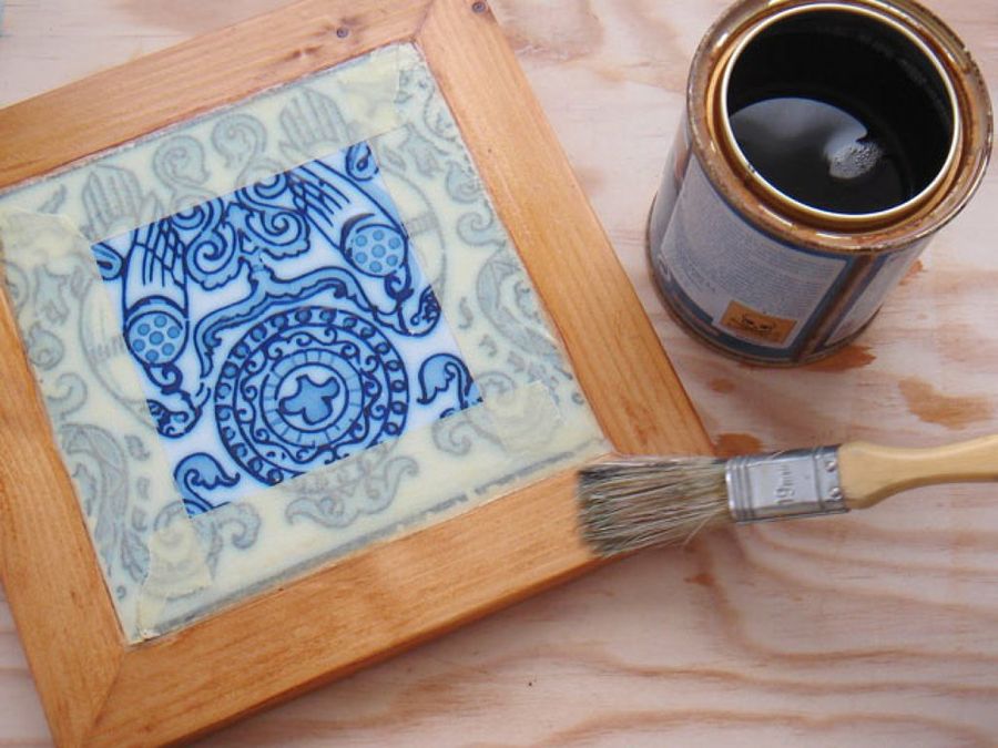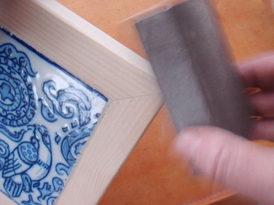 El marco presenta un satisfactorio pulido, y el adhesivo de montaje rellena bien los encuentros. Hemos visto que la madera de color caramelo combina bien con el añil del azulejo, así que barnizaremos el marco en esa tonalidad.