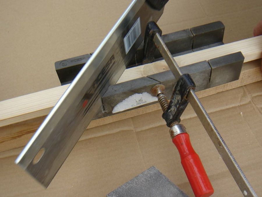 Hay que efectuar los cortes con mucha exactitud, de modo que ponemos el listón en la guía para ingletear y lo cortamos con el serrucho de costilla, más preciso que el normal.