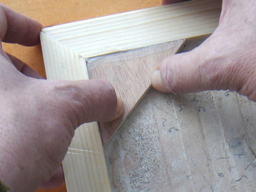 Ponemos el azulejo del revés, para que al final quede nivelado con el listón. Damos adhesivo de montaje en los bordes, encajamos el marco alrededor y ponemos en cada esquina un ángulo de contrachapado.