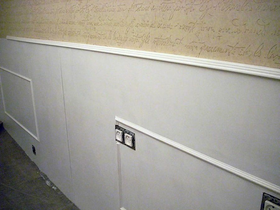Después de presentar los tableros del friso y comprobar los ajustes, Nus y su marido montaron el papel pintado en la parte alta de las paredes. A continuación, fijaron los tableros con silicona.